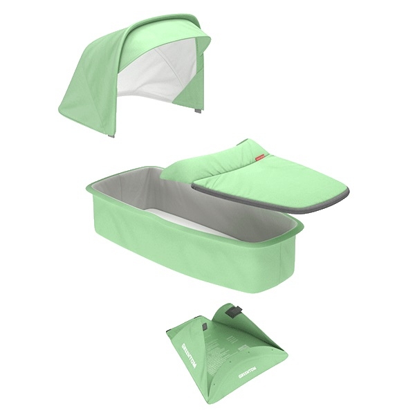 Všetky látky Greentom sú vyrobené z recyklovaných PET fliaš z nealkoholických nápojov. Na vaničku bolo použitých 53 PET fliaš. Vnútorná časť vaničky a striešky je podšitá látkou z bio bavlny, rovnako ako aj poťah matraca. Matrac tvoria vrstvy ovčieho rúna s jadrom z ľanového vlákna.