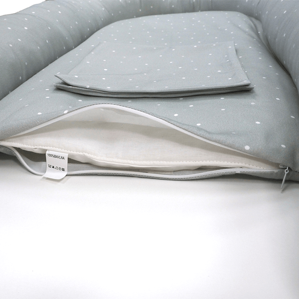 Hniezdo je možné používať obojstranne a je rastúce. Má praktickú šnúrku po obvode, ktorou je možné si jeho veľkosť upraviť podľa potreby. Aby sme docielili ešte väčšiu bezpečnosť, zaväzovanie je prekryté pásom na suchý zips, ktorý zároveň pomáha ešte lepšie držať tvar hniezda. Jeho ložná plocha je odzipsovateľnávnútorná výplň je vyberateľná, čo je z praktického hľadiska veľká výhoda. Umožňuje tým totiž oveľa ľahšiu manipuláciu pri jeho údržbe. Obvodový pás je vyplnený certifikovaným guľôčkovým dutým vláknom a vyberateľná výplň ložnej plochy je vyrobená zo 100% bavlny a dutého vlákna hrúbky 2cm.